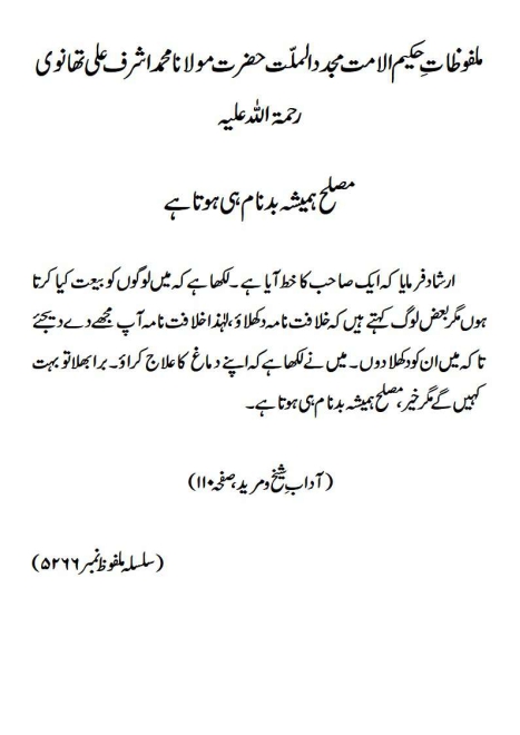 ارشاد فرمایا کہ ایک صاحب کا خط آیا ہے ۔ لکھا ہے کہ میں لوگوں کو بیعت کیا کرتا ہوں مگر بعض لوگ کہتے ہیں کہ خلافت نامہ دکھلاؤ، لہٰذا خلافت نامہ آپ مجھے دے دیجئے تاکہ میں ان کو دکھلا دوں۔ میں نے لکھا ہے کہ اپنے دماغ کا علاج کراؤ۔ برا بھلا تو بہت کہیں گے مگر خیر ، مصلح ہمیشہ بدنام ہی ہوتا ہے۔(آداب ِ شیخ و مرید، صفحہ ۱۱۰)