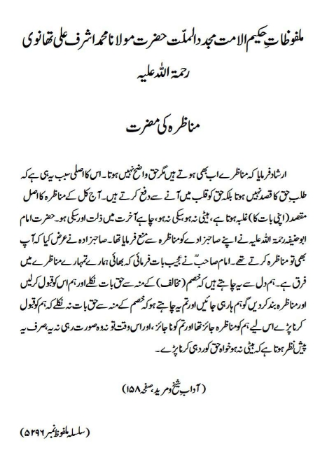 ارشاد فرمایا کہ مناظرے اب بھی ہوتے ہیں مگر حق واضح نہیں ہوتا ۔ اس کا اصلی سبب یہ ہی ہے کہ طلب ِ حق کا قصد نہیں ہوتا بلکہ حق کو قلب میں آنے سے دفع کرتے ہیں۔ آج کل کے مناظرہ کاا صل مقصد(اپنی بات کا) غلبہ ہوتا ہے ، ہیٹی نہ ہو ، سبکی نہ ہو، چاہے آخرت میں ذلت اور سبکی ہو۔ حضرت امام ابو حنیفہ رحمۃ اللہ علیہ نے اپنے صاحبزادے کو مناظرہ سے منع فرمایا تھا ۔ صاحبزادہ نے عرض کیا کہ آپ بھی تو مناظرہ کرتے تھے ۔ امام صاحبؒ نے عجیب بات فرمائی کہ بھائی ہمارے تمہارے مناظرے میں فرق ہے۔ ہم دل سے یہ چاہتے ہیں کہ خصم (مخالف) کے منہ سے حق بات نکلے اور ہم اس کو قبول کرلیں اور مناظرہ بند کردیں گو ہم ہار ہی جائیں اور تم یہ چاہتے ہو کہ خصم کے منہ سے حق بات نہ نکلے کہ ہم کو قبول کرنا پڑے اس لیے ہم کو مناظرہ جائز تھا اور تم کو ناجائز ، اور اس وقت تو نہ وہ صورت رہی نہ یہ، صرف یہ پیش نظر ہوتا ہے کہ ہیٹی نہ ہو خواہ حق کو رد ہی کرنا پڑے ۔(آداب ِ شیخ و مرید، صفحہ ۱۵۸)