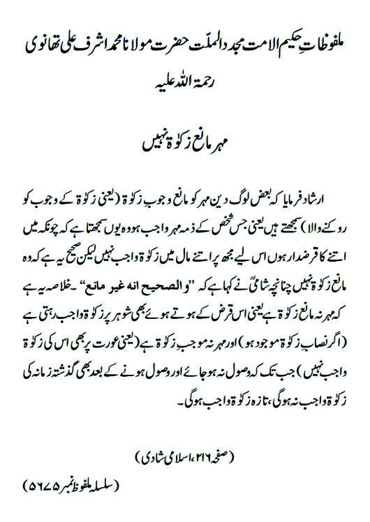 ارشاد فرمایا کہ بعض لوگ دین مہر کو مانع وجوبِ زکوٰۃ (یعنی زکوٰۃ کے وجوب کو روکنے والا) سمجھتے ہیں یعنی جس شخص کے ذمہ مہر واجب ہو وہ یوں سمجھتا ہے کہ چونکہ میں اتنے کا قرضدار ہوں اس لیے مجھ پر اتنے مال میں زکوٰۃ واجب نہیں لیکن صحیح یہ ہے کہ وہ مانع زکوٰۃ نہیں چنانچہ شامی ؒ نے کہا ہے کہ ’’والصحیح انہ غیر مانع‘‘ ۔ خلاصہ یہ ہے کہ مہر نہ مانع زکوٰۃ ہے یعنی اس قرض کے ہوتے ہوئے بھی شوہر پر زکوٰۃ واجب رہتی ہے (اگر نصابِ زکوٰۃ موجود ہو) اور مہر نہ موجب ِ زکوٰۃ ہے (یعنی عورت پر بھی اس کی زکوٰۃ واجب نہیں) جب تک کہ وصول نہ ہوجائے اور وصول ہونے کے بعد بھی گذشتہ زمانہ کی زکوٰۃ واجب نہ ہوگی ، تازہ زکوٰۃ واجب ہوگی۔(صفحہ ۲۱۶،اسلامی شادی)