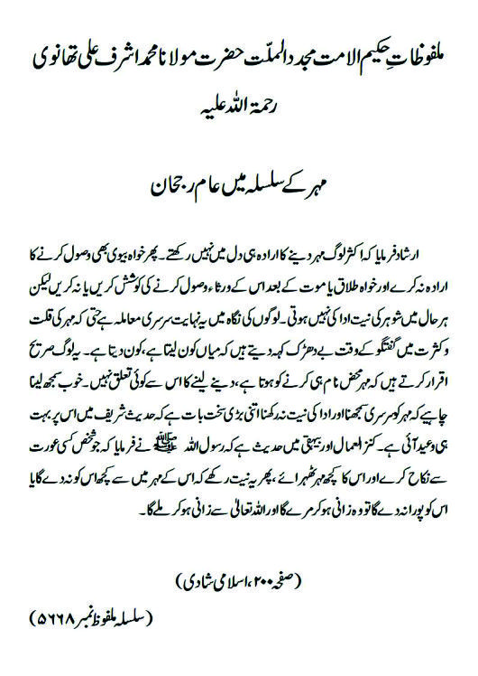 ارشاد فرمایا کہ اکثر لوگ مہر دینے کا ارادہ ہی دل میں نہیں رکھتے ۔ پھر خواہ بیوی بھی وصول کرنے کا ارادہ نہ کرے اور خواہ طلاق یا موت کے بعد اس کے ورثاء وصول کرنے کی کوشش کریں یا نہ کریں لیکن ہر حال میں شوہر کی نیت ادا کی نہیں ہوتی۔ لوگوں کی نگاہ میں یہ نہایت سرسری معاملہ ہے حتی کہ مہر کی قلت و کثرت میں گفتگو کے وقت بے دھڑک کہہ دیتے ہیں کہ میاں کون لیتا ہے، کون دیتا ہے۔ یہ لوگ صریح اقرار کرتے ہیں کہ مہر محض نام ہی کرنے کو ہوتا ہے ، دینے لینے کا اس سے کوئی تعلق نہیں۔خوب سمجھ لینا چاہیے کہ مہر کو سرسری سمجھنا اور ادا کی نیت نہ رکھنا اتنی بڑی سخت بات ہے کہ حدیث شریف میں اس پر بہت ہی وعید آئی ہے۔ کنز العمال اور بیہقی میں حدیث ہے کہ رسول اللہ ﷺ نے فرمایا کہ جو شخص کسی عورت سے نکاح کرے اور اس کا کچھ مہر ٹھہرائے ، پھر یہ نیت رکھے کہ اس کے مہر میں سے کچھ اس کو نہ دے گا یا اس کو پورا نہ دے گا تو وہ زانی ہوکر مرے گا اور اللہ تعالیٰ سے زانی ہوکر ملے گا۔(صفحہ ۲۰۰،اسلامی شادی)
