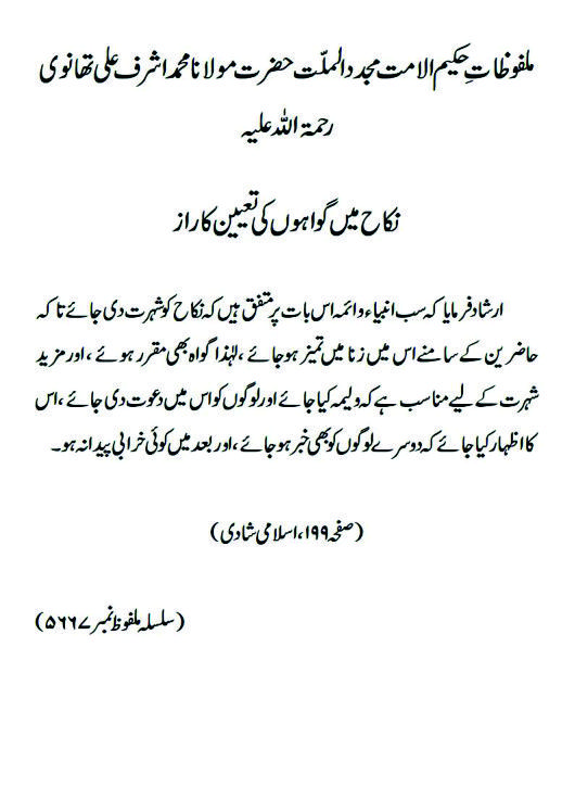 ارشاد فرمایا کہ سب انبیاء و ائمہ اس بات پر متفق ہیں کہ نکاح کو شہرت دی جائے تاکہ حاضرین کے سامنے اس میں زنا میں تمیز ہوجائے ، لہٰذا گواہ بھی مقرر ہوئے ، اور مزید شہرت کے لیے مناسب ہے کہ ولیمہ کیا جائے اور لوگوں کو اس میں دعوت دی جائے ، اس کا اظہار کیا جائے کہ دوسرے لوگوں کو بھی خبر ہوجائے ، اور بعد میں کوئی خرابی پیدا نہ ہو۔(صفحہ ۱۹۹،اسلامی شادی)