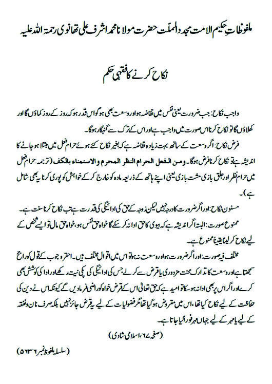 حکیم الامت حضرت مولانا اشرف علی تھانوی رحمہ اللہ تعالیٰ کے یہ ملفوظات نکاح یعنی اسلامی شادی سے متعلق ہیں ۔ ۔ خود بھی پڑھیں اور دوستوں سے بھی شئیر کریں ۔