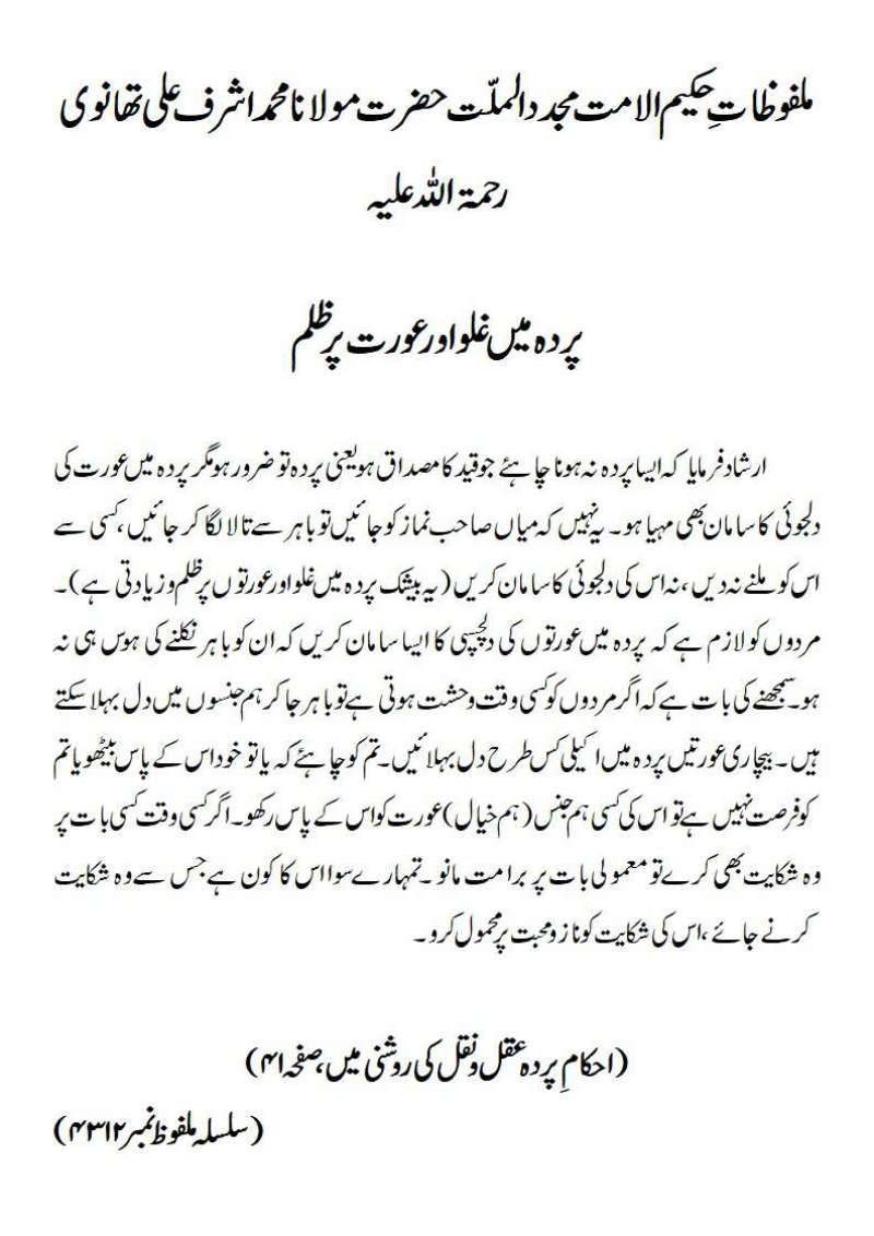 ارشاد فرمایا کہ ایسا پردہ نہ ہونا چاہئے جو قید کا مصداق ہو یعنی پردہ تو ضرور ہو مگر پردہ میں عورت کی دلجوئی کا سامان بھی مہیا ہو ۔ یہ نہیں کہ میاں صاحب نماز کو جائیں تو باہر سے تالا لگا کر جائیں ، کسی سے اس کو ملنے نہ دیں ، نہ اس کی دلجوئی کا سامان کریں ( یہ بیشک پردہ میں غلو اور عورتوں پر ظلم و زیادتی ہے) ۔ مردوں کو لازم ہے کہ پردہ میں عورتوں کی دلچسپی کا ایسا سامان کریں کہ ان کو باہر نکلنے کی ہوس ہی نہ ہو۔سمجھنے کی بات ہے کہ اگر مردوں کو کسی وقت وحشت ہوتی ہے تو باہر جا کر ہم جنسوں میں دل بہلا سکتے ہیں ۔ بیچاری عورتیں پردہ میں اکیلی کس طرح دل بہلائیں ۔ تم کو چاہئے کہ یا تو خود اس کے پاس بیٹھو یا تم کو فرصت نہیں ہے تو اس کی کسی ہم جنس(ہم خیال) عورت کو اس کے پاس رکھو ۔ اگر کسی وقت کسی بات پر وہ شکایت بھی کرے تو معمولی بات پر برا مت مانو ۔ تمہارے سوا اس کا کون ہے جس سے وہ شکایت کرنے جائے ، اس کی شکایت کو ناز و محبت پر محمول کرو۔ (احکام ِ پردہ عقل و نقل کی روشنی میں،صفحہ ۴۱)