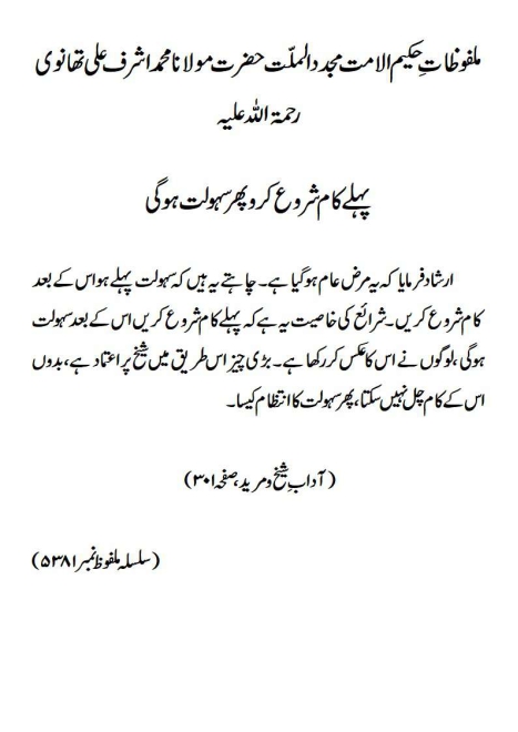 ارشاد فرمایا کہ یہ مرض عام ہوگیا ہے۔ چاہتے یہ ہیں کہ سہولت پہلے ہو اس کے بعد کام شروع کریں ۔ شرائع کی خاصیت یہ ہے کہ پہلے کام شروع کریں اس کے بعد سہولت ہوگی، لوگوں نے اس کا عکس کر رکھا ہے ۔ بڑی چیز اس طریق میں شیخ پر اعتماد ہے ، بدوں اس کے کام چل نہیں سکتا، پھر سہولت کا انتظام کیسا۔(آداب ِ شیخ و مرید، صفحہ ۳۰۱)