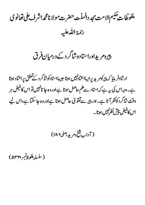 ارشاد فرمایا کہ پیر کو مرید پر ایسا اعتماد نہیں ہوتا جیسا استاد کو شاگرد کے تعلق پر اعتماد ہوتا ہے۔ وجہ اس کی یہ ہے کہ استاد سے علم حاصل ہوتا ہے اور وہ جاتا نہیں تو ا س کا فیض ہر وقت شاگرد کو نظر آتا ہے۔ اور پیر سے تقویٰ حاصل ہوتا ہے اور وہ جا سکتا ہے، اس لیے اس کا فیض پیش نظر نہیں ہوتا۔(آداب ِ شیخ و ِ شیخ و مرید، صفحہ ۱۸۶)