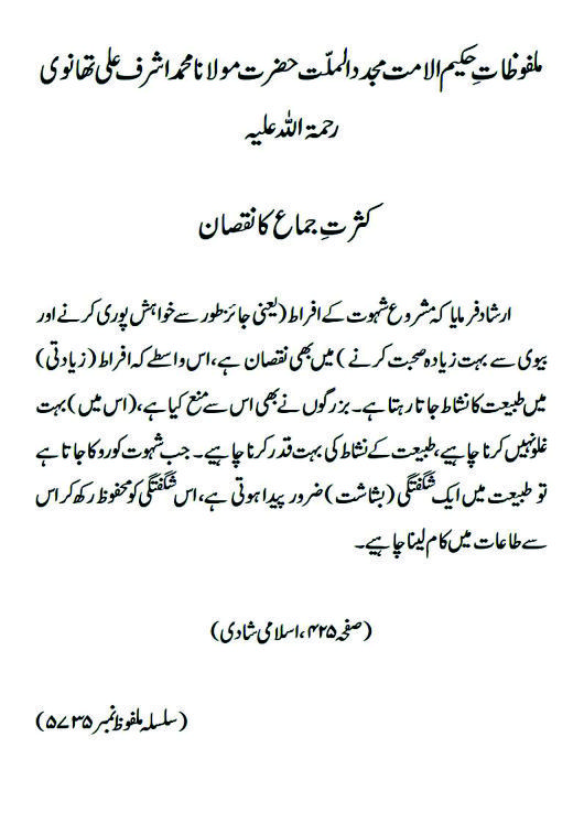 ارشاد فرمایا کہ مشروع شہوت کے افراط (یعنی جائز طور سے خواہش پوری کرنے اور بیوی سے بہت زیادہ صحبت کرنے ) میں بھی نقصان ہے ، اس واسطے کہ افراط (زیادتی) میں طبیعت کا نشاط جاتا رہتا ہے ۔ بزرگوں نے بھی اس سے منع کیا ہے ، (اس میں) بہت غلو نہیں کرنا چاہیے، طبیعت کے نشاط کی بہت قدر کرنا چاہیے ۔ جب شہوت کو روکا جاتا ہے تو طبیعت میں ایک شگفتگی (بشاشت) ضرور پیدا ہوتی ہے، اس شگفتگی کو محفوظ رکھ کر اس سے طاعات میں کام لینا چاہیے۔(صفحہ۴۲۵،اسلامی شادی)