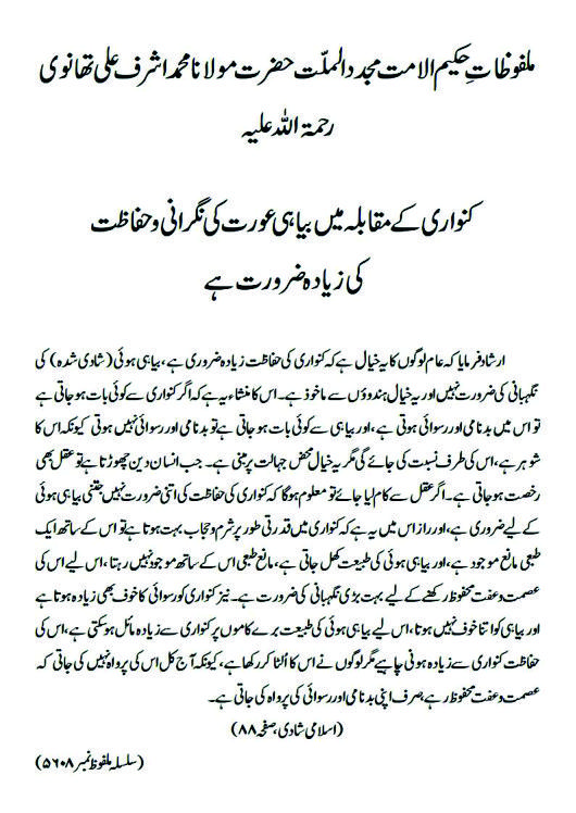 ارشاد فرمایا کہ عام لوگوں کا یہ خیال ہے کہ کنواری کی حفاظت زیادہ ضروری ہے ، بیاہی ہوئی(شادی شدہ) کی نگہبانی کی ضرورت نہیں اور یہ خیال ہندوؤں سے ماخوذ ہے ۔ اس کا منشاء یہ ہے کہ اگر کنواری سے کوئی بات ہو جاتی ہے تو اس میں بدنامی اور رسوائی ہوتی ہے ، اور بیاہی سے کوئی بات ہو جاتی ہے تو بدنامی اور رسوائی نہیں ہوتی کیونکہ اس کا شوہر ہے ، اس کی طرف نسبت کی جائے گی مگر یہ خیال محض جہالت پر مبنی ہے۔ جب انسان دین چھوڑتا ہے تو عقل بھی رخصت ہوجاتی ہے ۔ اگر عقل سے کام لیا جائے تو معلوم ہوگا کہ کنواری کی حفاظت کی اتنی ضرورت نہیں جتنی بیاہی ہوئی کے لیے ضروری ہے ، اور راز اس میں یہ ہے کہ کنواری میں قدرتی طور پر شرم و حجاب بہت ہوتا ہے تو اس کے ساتھ ایک طبعی مانع موجود ہے ، اور بیاہی ہوئی کی طبیعت کھل جاتی ہے ، مانع طبعی اس کے ساتھ موجود نہیں رہتا ، اس لیے اس کی عصمت و عفت محفوظ رکھنے کے لیے بہت بڑی نگہبانی کی ضرورت ہے ۔ نیز کنواری کو رسوائی کا خوف بھی زیادہ ہوتا ہے اور بیاہی کو اتنا خوف نہیں ہوتا ، اس لیے بیاہی ہوئی کی طبیعت برے کاموں پر کنواری سے زیادہ مائل ہو سکتی ہے ، اس کی حفاظت کنواری سے زیادہ ہونی چاہیے مگر لوگوں نے اس کا اُلٹا کر رکھا ہے ، کیونکہ آج کل اس کی پرواہ نہیں کی جاتی کہ عصمت و عفت محفوظ رہے ، صرف اپنی بدنامی اور رسوائی کی پرواہ کی جاتی ہے۔(صفحہ ۸۸،اسلامی شادی)
