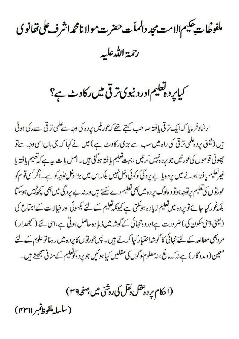 ارشاد فرمایا کہ ایک ترقی یافتہ صاحب کہتے تھے کہ عورتیں پردہ کی وجہ سے علمی ترقی سے رکی ہوئی ہیں (یعنی پردہ علمی ترقی کی راہ میں سب سے بڑی رکاوٹ ہے) میں نے کہا کہ جی ہاں اسی وجہ سے تو چھوٹی قوموں کی عورتیں جو پردہ نہیں کرتیں ، بہت تعلیم یافتہ ہو گئی ہیں۔ اصل بات یہ ہے کہ تعلیم یافتہ یا غیر تعلیم یافتہ ہونے میں پردہ یا بے پردگی کو کوئی دخل نہیں بلکہ اس میں بڑا دخل توجہ کو ہے ۔ اگر کسی قوم کو عورتوں کی تعلیم پر توجہ ہو تو وہ لوگ پردہ میں بھی تعلیم دے سکتے ہیں ورنہ بے پردگی میں بھی کچھ نہیں ہوسکتا بلکہ غور کیا جائے تو پردہ میں تعلیم زیادہ ہو سکتی ہے کیونکہ تعلیم کے لئے یکسوئی اور خیالات کے اجتماع کی (یعنی ذہنی سکون کی) ضرورت ہے اور وہ تنہائی کے گوشہ میں زیادہ حاصل ہوتی ہے ، اسی لئے (سمجھدار) مرد بھی مطالعہ کے لئے تنہائی کا گوشہ اختیار کیا کرتے ہیں۔ پس عورتوں کا پردہ میں رہنا تو علوم کے لئے معین (و مددگار) ہے نہ کہ مانع، نہ معلوم لوگوں کی عقلیں کیا ہوئیں جو پردہ کو تعلیم کے منافی سمجھتے ہیں۔ (احکام ِ پردہ عقل و نقل کی روشنی میں،صفحہ ۳۹)
