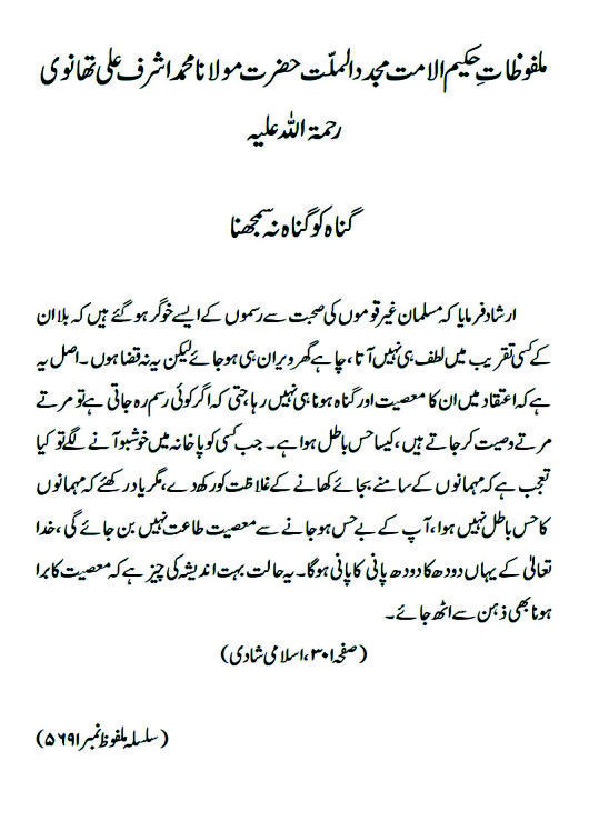 ارشاد فرمایا کہ مسلمان غیر قوموں کی صحبت سے رسموں کے ایسے خوگر ہوگئے ہیں کہ بلا ان کے کسی تقریب میں لطف ہی نہیں آتا ، چاہے گھر ویران ہی ہو جائے لیکن یہ نہ قضا ہوں ۔ اصل یہ ہے کہ اعتقاد میں ان کا معصیت اور گناہ ہونا ہی نہیں رہا ، حتی کہ اگر کوئی رسم رہ جاتی ہے تو مرتے مرتے وصیت کر جاتے ہیں ، کیسا حس باطل ہوا ہے ۔ جب کسی کو پاخانہ میں خوشبو آنے لگے تو کیا تعجب ہے کہ مہمانوں کے سامنے بجائے کھانے کے غلاظت کو رکھ دے ، مگر یاد رکھئے کہ مہمانوں کا حس باطل نہیں ہوا ، آپ کے بے حس ہوجانے سے معصیت طاعت نہیں بن جائے گی ، خدا تعالیٰ کے یہاں دودھ کا دودھ پانی کا پانی ہوگا۔یہ حالت بہت اندیشہ کی چیز ہے کہ معصیت کا برا ہونا بھی ذہن سے اٹھ جائے۔(صفحہ ۳۰۱،اسلامی شادی)