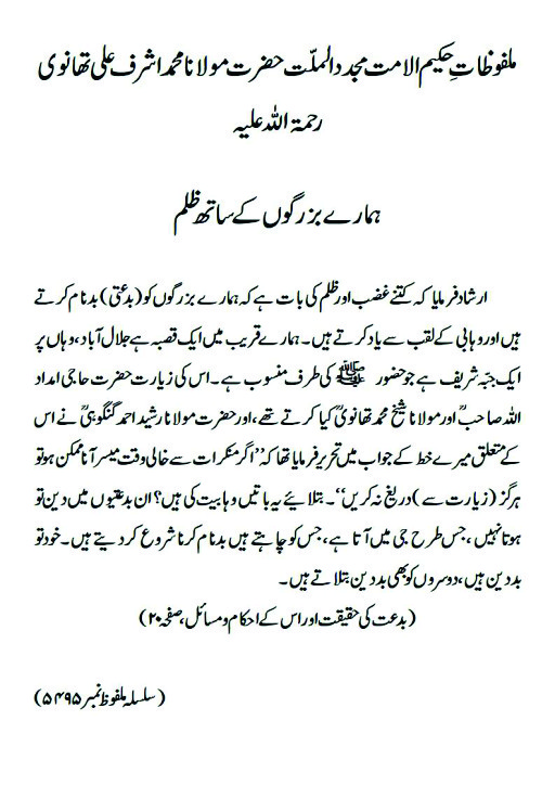 ارشاد فرمایا کہ کتنے غضب اور ظلم کی بات ہے کہ ہمارے بزرگوں کو (بدعتی) بدنام کرتے ہیں اور وہابی کے لقب سے یاد کرتے ہیں۔ہمارے قریب میں ایک قصبہ ہے جلال آباد، وہاں پر ایک جبّہ شریف ہے جو حضور ﷺ کی طرف منسوب ہے ۔ اس کی زیارت حضرت حاجی امداد اللہ صاحب ؒ اور مولانا شیخ محمد تھانویؒ کیا کرتے تھے، اور حضرت مولانا رشید احمد گنگوہی ؒ نے اس کے متعلق میرے خط کے جواب میں تحریر فرمایا تھا کہ ’’ اگر منکرات سے خالی وقت میسر آنا ممکن ہو تو ہرگز (زیارت سے) دریغ نہ کریں‘‘۔ بتلائیے یہ باتیں وہابیت کی ہیں؟ ان بدعتیوں میں دین تو ہوتا نہیں ، جس طرح جی میں آتا ہے ، جس کو چاہتے ہیں بدنام کرنا شروع کر دیتے ہیں۔ خود تو بد دین ہیں ، دوسروں کو بھی بد دین بتلاتے ہیں۔(بدعت کی حقیقت اور اس کے احکام و مسائل، صفحہ ۲۰)