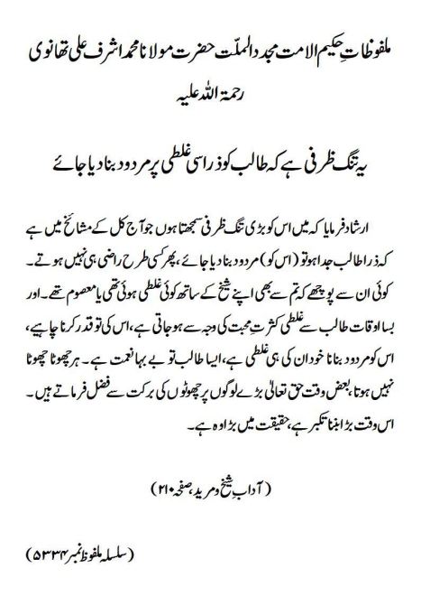 ارشاد فرمایا کہ میں اس کو بڑی تنگ ظرفی سمجھتا ہوں جو آج کل کے مشائخ میں ہے کہ ذرا طالب جدا ہو تو (اس کو) مردود بنا دیا جائے، پھر کسی طرح راضی ہی نہیں ہوتے ۔ کوئی ان سے پوچھے کہ تم سے بھی اپنے شیخ کے ساتھ کوئی غلطی ہوئی تھی یا معصوم تھے۔ اور بسا اوقات طالب سے غلطی کثرتِ محبت کی وجہ سے ہوجاتی ہے ، اس کی تو قدر کرنا چاہیے ، اس کو مردود بنانا خود ان کی ہی غلطی ہے، ایسا طالب تو بے بہا نعمت ہے ۔ ہر چھوٹا چھوٹا نہیں ہوتا، بعض وقت حق تعالیٰ بڑے لوگوں پر چھوٹوں کی برکت سے فضل فرماتے ہیں ۔ اس وقت بڑا بننا تکبر ہے ، حقیقت میں بڑا وہ ہے۔(آداب ِ شیخ و مرید، صفحہ ۲۱۰)